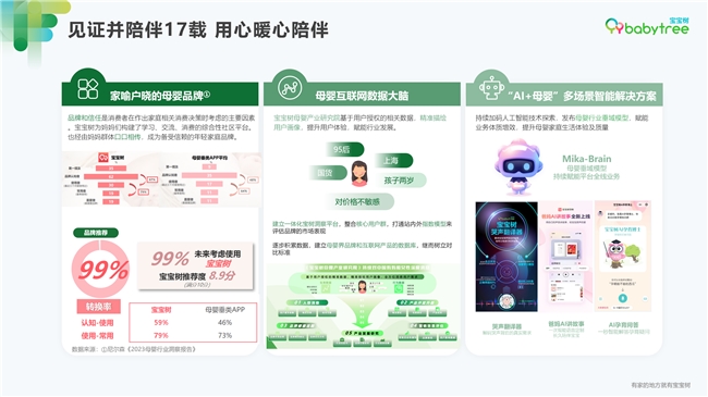 深耕母婴市场多年,在维持行业优势的同时,宝宝树紧跟趋势进行数字化转型,利用大数据和人工智能技术为年轻家庭提供全方位的育儿支持。其中,宝宝树母婴产业研究院通过用户授权的数据,构建母婴互联网数据大脑,精准描绘用户画像,提升用户体验并赋能行业发展。同时,通过“AI+母婴”多场景智能解决方案,宝宝树不断探索人工智能技术,以提高业务效率和母婴家庭的生活质量。例如,通过其自研的Mika-Brain母婴垂域模型,宝宝树成功实现了多场景下的智能解决方案。哭声翻译器解码婴儿哭声背后的真实需求,利用AI讲故事功能为宝宝提供个性化的陪伴,以及通过母婴产业研究院的数据分析,精准描绘用户画像,赋能行业发展。
