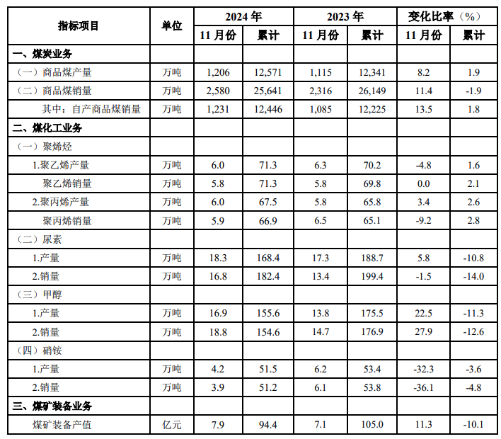 中煤能源12月17日公告,2024年11月份商品煤销量为2580万吨,同比增长11.4%;本年累计商品煤销量为2.56亿吨,同比下降1.9%。