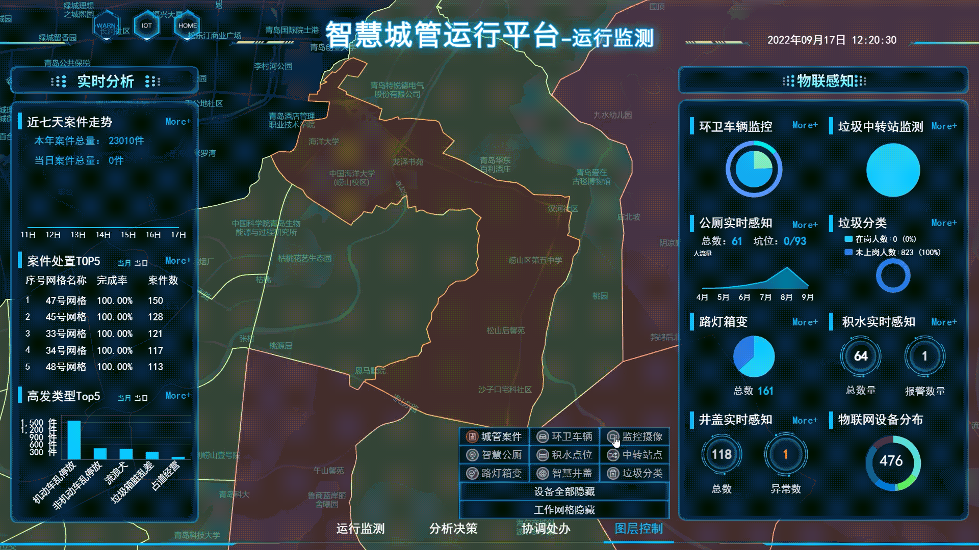 在顶端层面,崂山通过专门搭建智慧城管综合业务集成平台,以综合性城市管理数据库和大数据运算技术为基础,一图呈现城市管理和运行各资源要素的空间分布和即时状态,构建城市管理分析决策的大脑中枢,实现“一脑控所有”;