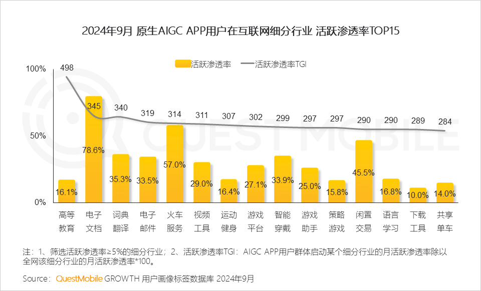 AIGC用户在电子文档行业的活跃渗透率TGI突破300,同时职场办公已经成为AIGC APP中最热门的功能之一。