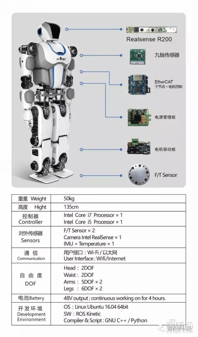 与机械臂、小型人形机器人常采用的舵机部件不同。钢铁侠大仿人机器人直接采用电机驱动,再根据不同关节的活动能力进行优化和调节。在自由度方面,钢铁侠科技的ART机器人单腿是六个自由度,双腿是十二个自由度,踝关节是两个自由度,髋关节是三个自由度,这让机器人走路类似于人的姿态。
