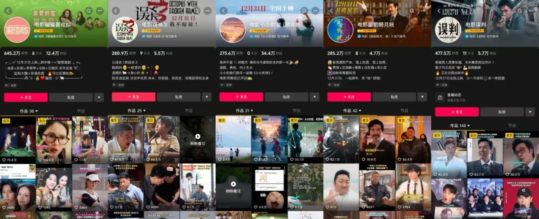 这批项目中,算下来也仅有《误判》在兢兢业业按照经典套路投入短视频宣发。而片方营销力度的收缩也最直接影响到了数据,截至发稿,几部影片中官抖数据最好的《骗骗喜欢你》总点赞不过645w+。