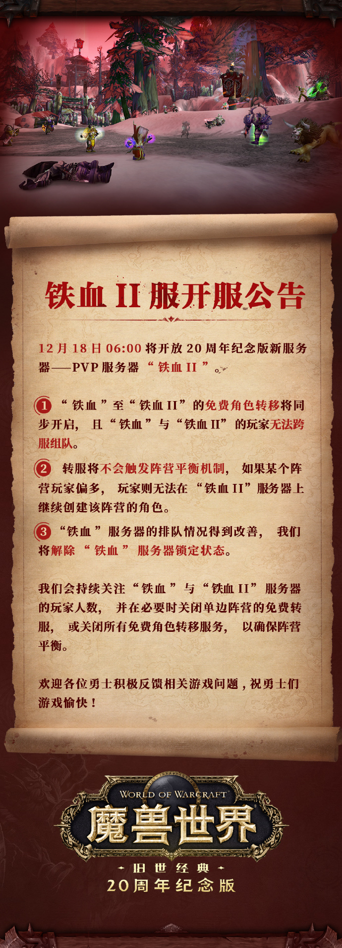 12月17日晚间,《魔兽世界》官方运营团队发布公告称,近期观察到铁血服存在人数过多导致服务器出现排队,严重影响玩家游戏体验的情况。运营团队就此问题紧急与暴雪团队展开沟通并进行了技术评估,决定将于12月18日06:00,正式开启铁血II(PVP)服务器。