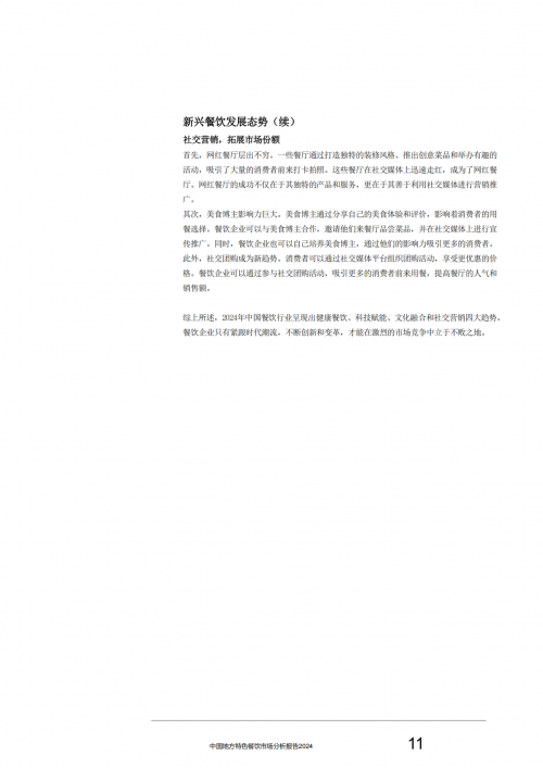 综上所述,2024年中国餐饮行业呈现出健康餐饮、科技赋能、文化融合和社交营销四大趋势。餐饮企业只有紧跟时代潮流,不断创新和变革,才能在激烈的市场竞争中立于不败之地。