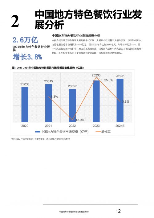 本报告统计地方特色餐饮主要包括中式正餐、火锅和小吃快餐三大细分类别。2023年中国地方特色餐饮总市场规模为25236亿元,预计2024年将达到26195亿元,年增长率约为3.8%。其中中式正餐市场持续扩容,地方菜系发展迅速;以酸汤火锅和牛肉火锅为主的火锅市场表现亮眼;小吃快餐市场由于受到餐饮创业者青睐,市场规模有望持续增长。