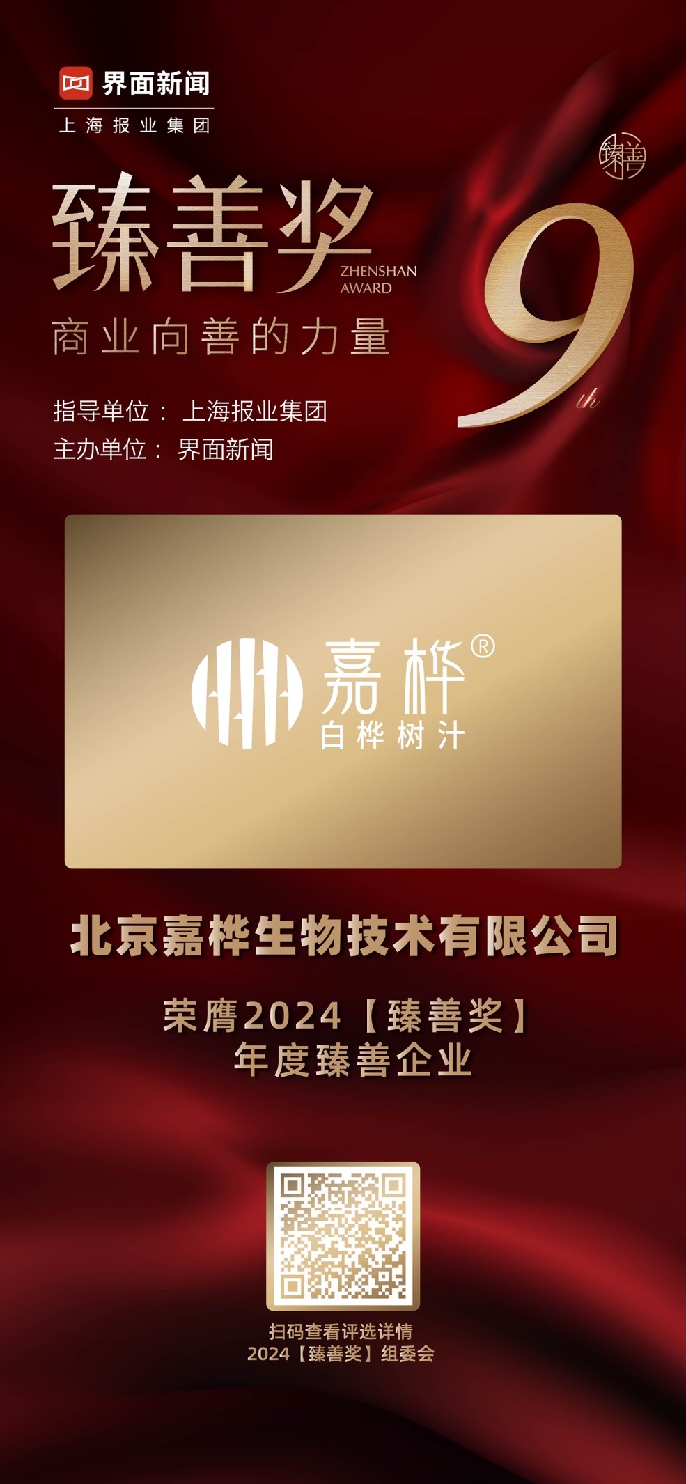 12月18日,上海报业集团 | 界面新闻在上海世博创意秀场举办了2024【臻善奖】颁奖典礼,并正式公布了本年度获奖名单。聚“商业向善”之力,本届【臻善奖】吸引了一大批在公益慈善领域有所贡献的优秀企业和公益人士参与。北京嘉桦生物技术有限公司凭借其在可持续发展、生态保护以及社会责任领域的杰出表现,荣膺年度臻善企业。