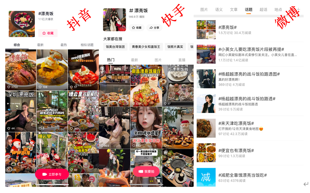 而在其他平台,漂亮饭则不那么热门:相关话题在抖音的播放量约1亿次,快手只有百万级别,微博阅读量则不到30万。