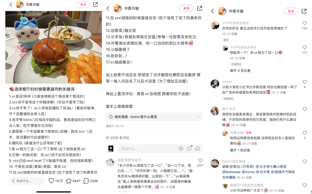 小红书就有博主总结探店套路来规避,比如用户“许愿月猫”发布笔记《选择餐厅的时候需要避开的关键词》,将“首店快冲”“你不宣传这个你糊涂啊”“终于有了”“下了高铁直奔”“就为了这一口”“已经next level了”等常见探店表述列入“雷区”。笔记收获了1.6万点赞,超过2000条评论,有的用户表示“看到这些字已经觉得难吃了”,“在广告的夹缝里找有用的信息”。
