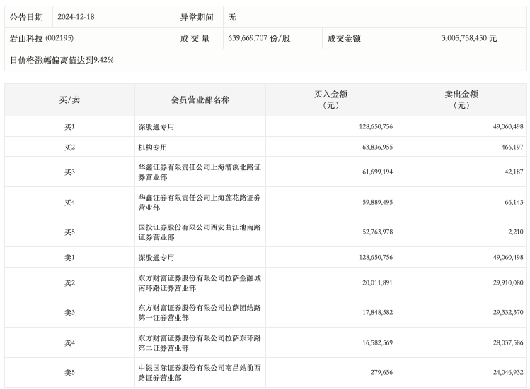 12月18日,岩山科技今日涨停,成交额30.06亿元,换手率11.40%,盘后龙虎榜数据显示,深股通专用席位买入1.29亿元并卖出4906.05万元,一机构专用席位净买入6337.08万元。