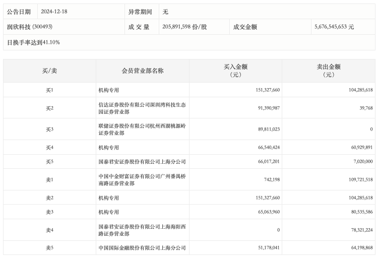 12月18日,润欣科技今日涨停,龙虎榜数据显示,上榜营业部席位全天成交10.87亿元,占当日总成交金额比例为19.15%。其中,买入金额为5.82亿元,卖出金额为5.05亿元,合计净买入7701.9万元。