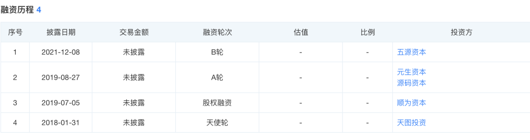 作为新茶饮赛道的一员,茶颜悦色也收获了不少投资机构的押注。据天眼查数据显示,茶颜悦色在2018年到2021年共经历了4轮融资——分别是天图投资的天使轮、顺为资本的股权融资,以及元生资本、源码资本的A轮融资,五源资本的B轮融资。