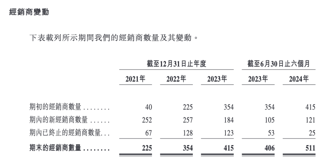 2022年末、2023年末以及2024年上半年末,该公司的经销商数量分别为354家、415家和511家。