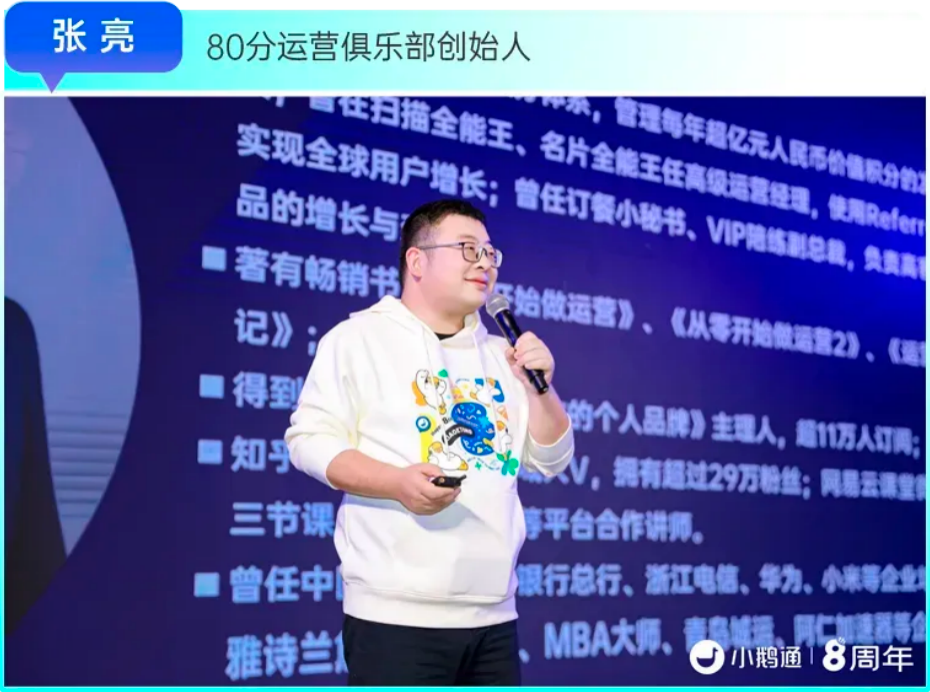 张亮老师是《从零开始做运营》系列畅销书作者,在八周年大会中主要分享了关于商家如何进行用户规划的见解。