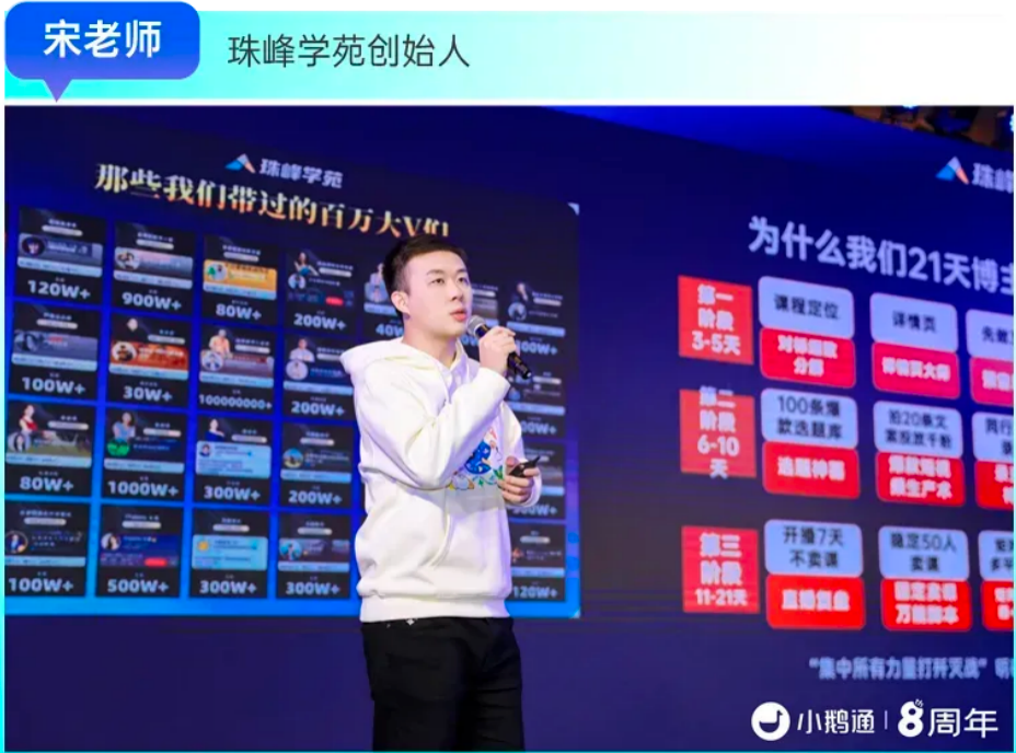 宋老师是全网40万粉丝的做课卖课博主,培训了 36000 多个知识博主,所带出的优秀学员与老师在单月卖课业绩可达 100 万乃至 300 万;同时,其担任一家 MCN 公司的负责人,签约博主涉及青少年健康赛道、中老年赛道等多个领域。