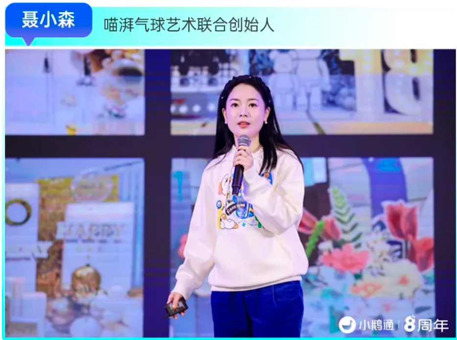第一位分享嘉宾是来自小鹅通重庆社群的聂小森老师,一出场就展示了精美绝伦的气球艺术,瞬间点燃了现场的气氛。