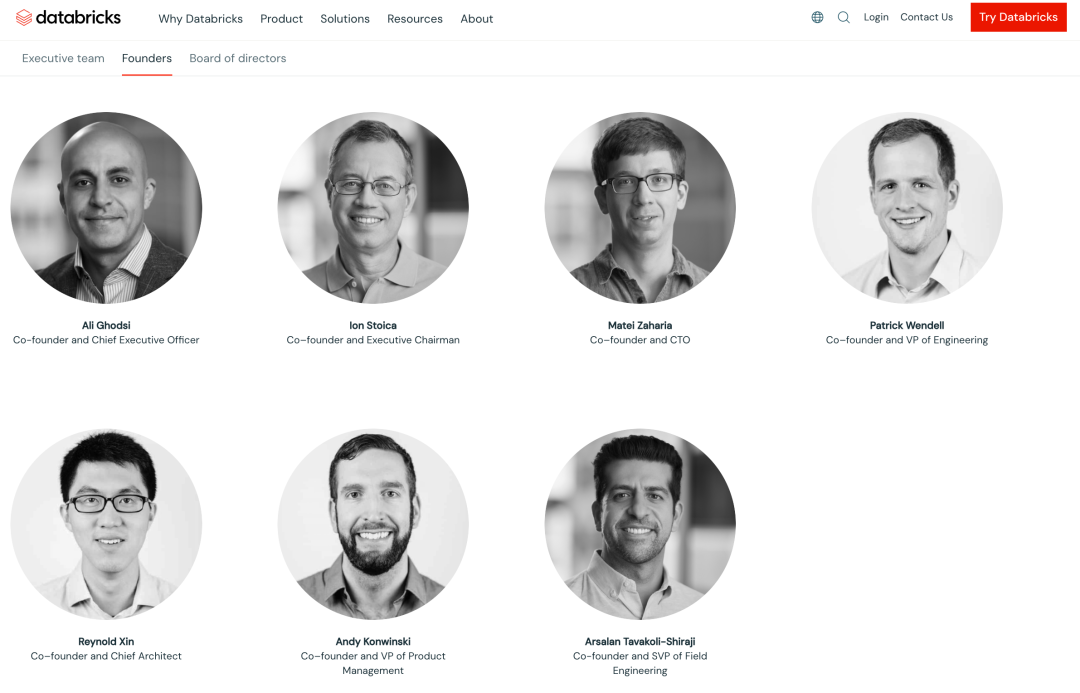 在2016年1月担任首席执行官之前,Ali Ghodsi曾担任公司的工程和产品管理副总裁,也是开源项目Apache Spark的创建者之一。除了在Databricks工作外,Ghodsi Ali还担任加州大学伯克利分校的兼职教授,并担任加州大学伯克利分校RiseLab的董事会成员。
