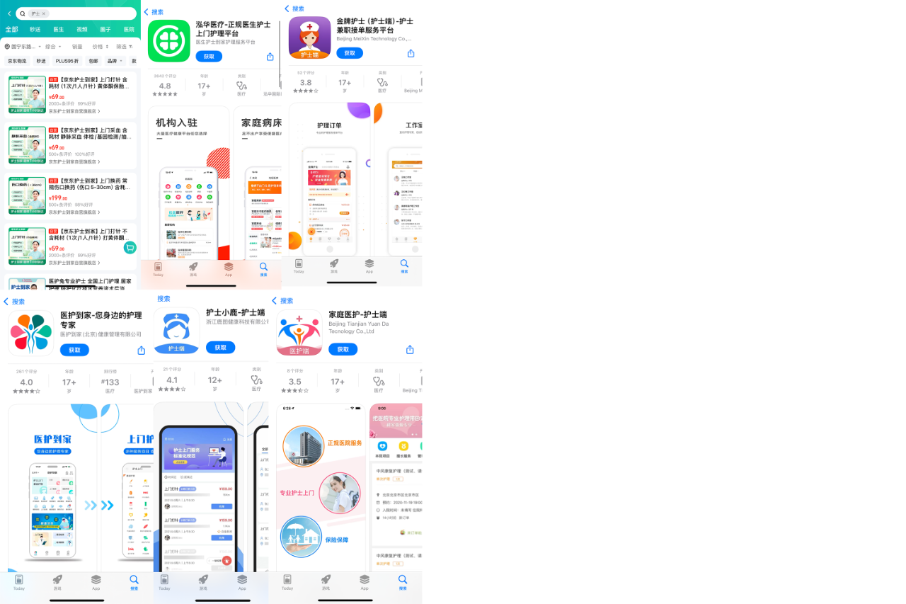到目前为止,网约护士发展已有5年,现在除了护士到家这样的专业平台之外,京东、淘宝、美团、小红书,甚至闲鱼上,都有了网约护士的身影。