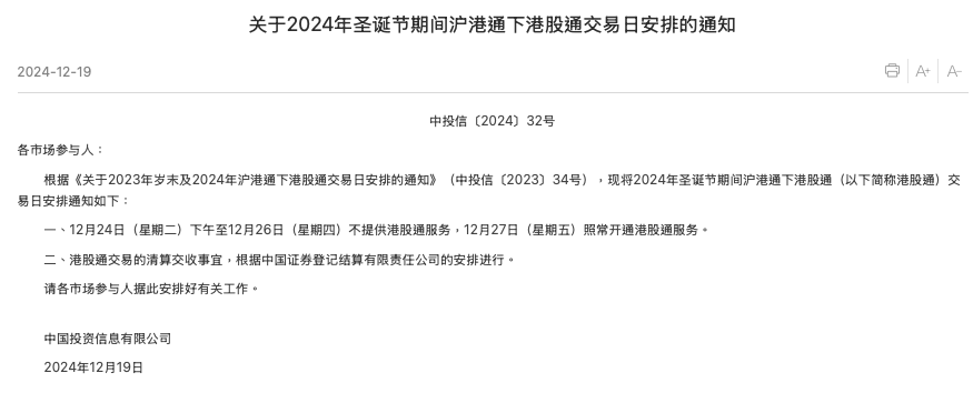 上交所12月19日发布圣诞节期间港股通交易日安排,12月24日(星期二)下午至12月26日(星期四)不提供港股通服务,12月27日(星期五)照常开通港股通服务。