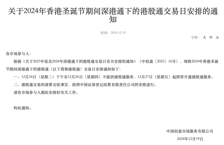 深交所12月19日发布圣诞节期间深港通下的港股通交易日安排,12月24日(星期二)下午至12月26日(星期四)不提供港股通服务,12月27日(星期五)起照常开通港股通服务。