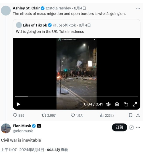 斯塔默的讲话后,马斯克开始在X平台上频繁回复与英国骚乱有关的推文。8月4日,他转发了一条指责大规模移民引发骚乱的推文,并评论称英国将迎来“内战”。英国政府立刻对马斯克提出抗议,批评其说法毫无根据并再次敦促社交媒体采取行动阻止仇恨言论传播。