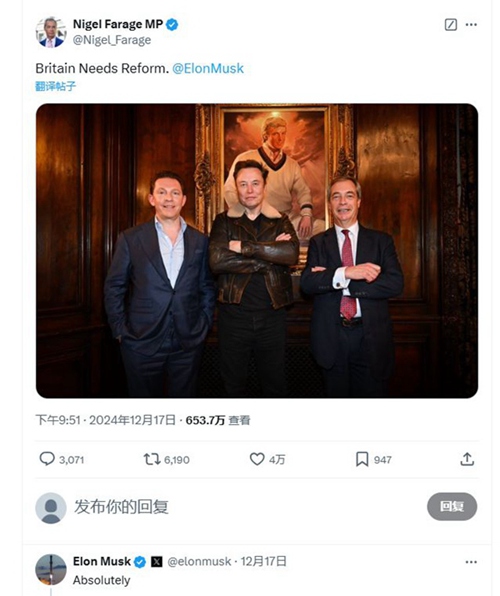 2024年12月17日,改革英国党党首奈杰尔·法拉奇在X平台上放出与马斯克在美国佛罗里达州海湖庄园的合影,并配文称英国需要改革。马斯克回复:绝对的。