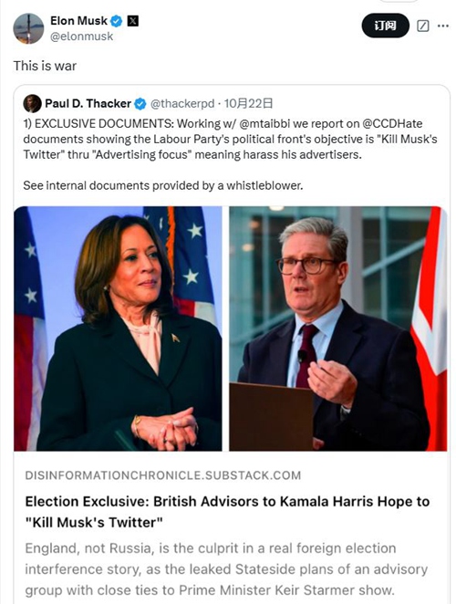 10月,与工党关系密切的英国非营利性机构“反数字仇恨中心”被曝出向广告商施压,要求广告商不要投放广告以“杀死”马斯克的X平台。马斯克转发相关消息后直接宣布:这是战争。