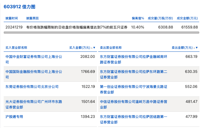 12月19日,佳力图今日涨停,龙虎榜数据显示,上榜营业部席位全天成交1.11亿元,占当日总成交金额比例为17.99%。其中,买入金额为8266.76万元,卖出金额为2805.06万元,合计净买入5461.7万元。