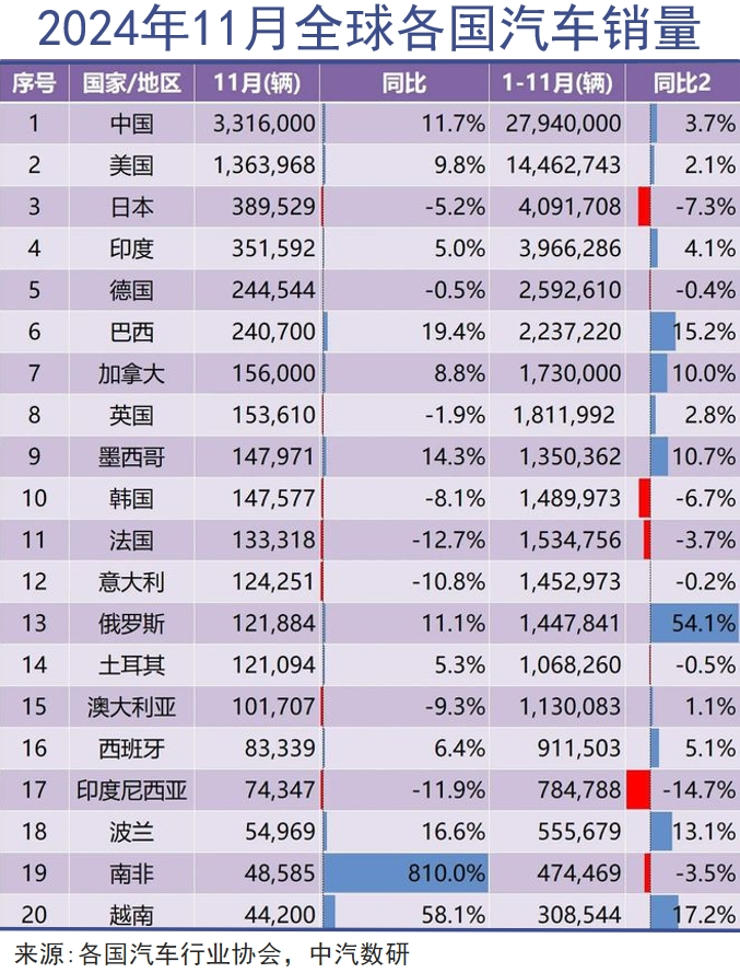 甚至,这样的变化不止在日本汽车身上发生。根据最新的数据,1-11月全球各国汽车销量排行中,前十名中,日本、德国、韩国均出现了同比下滑。而这三个国家的汽车厂商正好占据了世界汽车集团前三名。