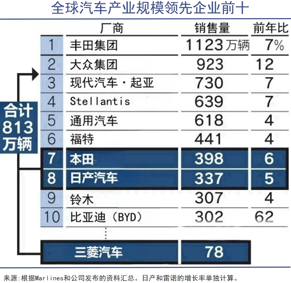 根据公开的数据,这三家车企在全球的整体销量超过800万辆。如果三家企业统合,将超过现代汽车起亚,成为世界第三大汽车集团。
