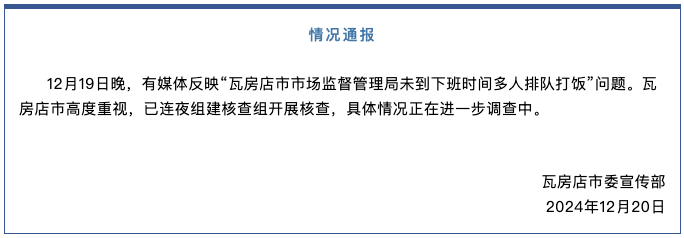 辽宁瓦房店市委宣传部12月20日通报,12月19日晚,有媒体反映“瓦房店市市场监督管理局未到下班时间多人排队打饭”问题。瓦房店市高度重视,已连夜组建核查组开展核查,具体情况正在进一步调查中。