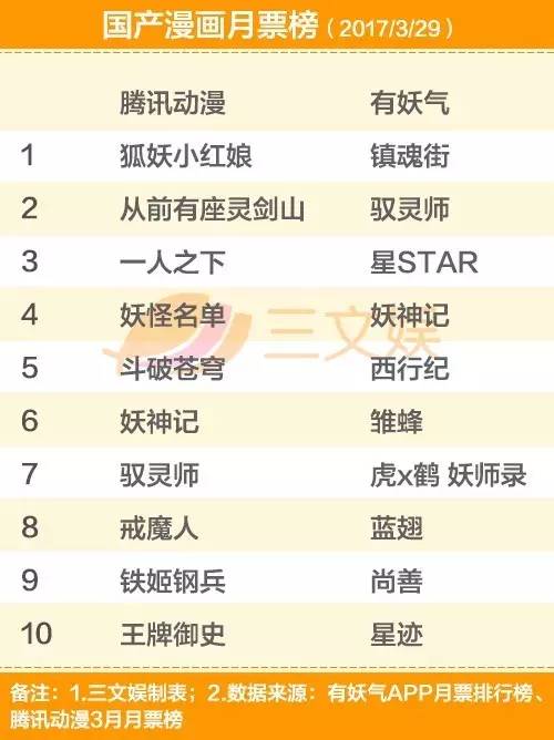 3月的腾讯动漫和有妖气漫画月票榜都略显平淡,腾讯动漫方面,上月登上月票榜前十的《铁姬钢兵》本月仍然留在榜单上,本月排在第9位。其他漫画都是耳熟能详的作品,值得一提的是,《狐妖小红娘》本月11日重新开始连载了,并且不再有任何夏天岛logo的字样,加上恢复连载时连续两天的限免活动,这部作品从上月的第9位上升至本月首位。