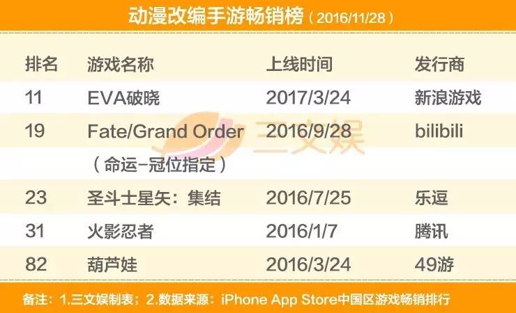 本月的动漫改编手游榜单上,《FGO》仍然凭借其不断推出的新卡池活动而持续畅销,目前位于畅销榜第19位。《火影忍者》、《圣斗士星矢:集结》、《葫芦娃》与上月的情况差不多,排名变动相对较小,不过上月排名不错的《不良人2》和《龙珠激斗》于本月掉出了畅销榜TOP100。新面孔《EVA破晓》成绩优异,刚上线就已排至畅销榜11位,看来《EVA》这个日本的国民IP在国内的粉丝数量也相当庞大。