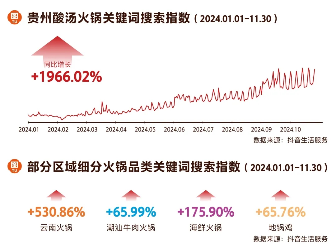 抖音火锅关键词搜索指数显示,贵州酸汤火锅同比增长1966.02%,是今年火锅市场中的“黑马品类”。海鲜火锅、潮汕牛肉火锅和地锅鸡等细分品类同样热度高涨,成为社交平台的热门搜索词。
