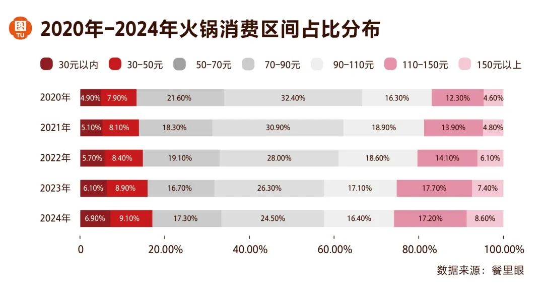 如下图所示,火锅消费价格区间呈现两极增长、中间收缩的势态。由2020年到2024年的数据变化来看,50元以下价格带占比增长了2.4%,110元以上价格带占比增长了8.9%。
