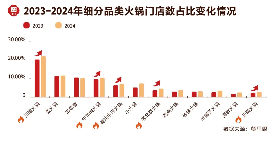 餐里眼数据显示:2024年以来,川渝火锅、牛羊肉火锅、潮汕牛肉火锅、老北京火锅、云南火锅等细分区域品类门店数占比增速明显。