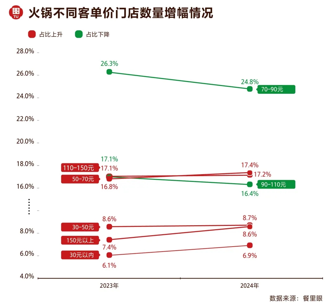 餐里眼数据显示:2024年,在低价格带,30元以内客单价火锅门店数量占比6.9%,30-50元占比8.7%,50-70元占比17.4%,相较于2023年均有所上涨;在高价格带150元以上客单价火锅门店数量占比8.6%,较去年有所上涨。