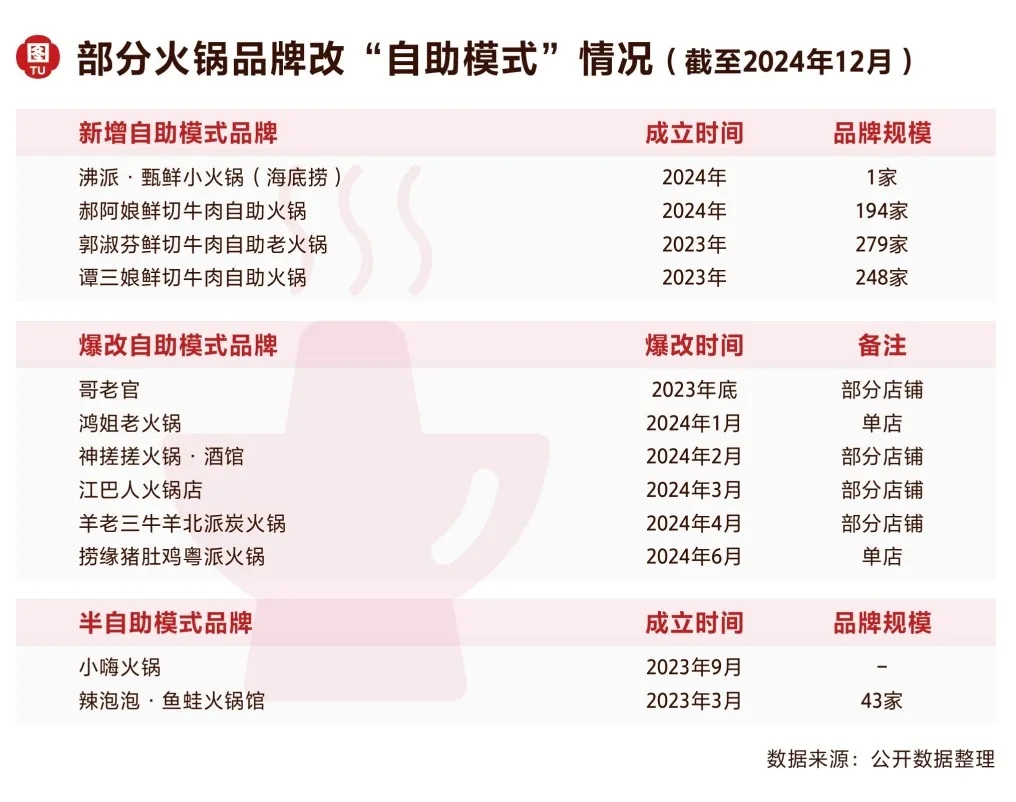此外,2024年自助的风潮也吹向了火锅赛道,一大批品牌开始拥抱自助模式。新兴的自助火锅品牌有谭三娘、郝阿娘、郭淑芬等鲜切牛肉自助火锅;爆改自助模式的有哥老官、鸿姐老火锅等品牌;半自助模式的有小嗨火锅等等。