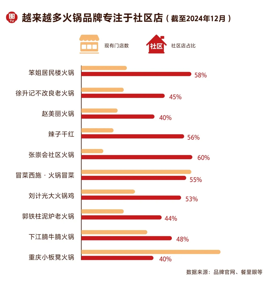 一些火锅品牌瞄准了社区空白点,选择和消费者成为邻居。餐里眼数据显示,2024年火锅店选址分布中,便捷的社区店(含乡镇店)占比达到58.51%,远高于其它点位分布。