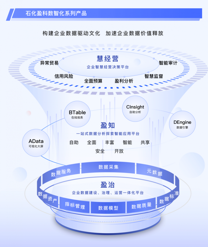 在数据业务领域,石化盈科以“构建企业数据驱动文化,加速企业数据价值释放”为核心理念,打造全面、专业、智能的数据治理、数据分析、数据应用产品体系,为客户提供高效、全面的数字化服务与解决方案,推出“盈治”“盈知”“慧经营”等一系列数智化产品,助力中国石油、中国华能、中国船舶等多家大型央国企及新凤鸣、康养集团等行业标杆企业在数智化转型的浪潮中勇立潮头。