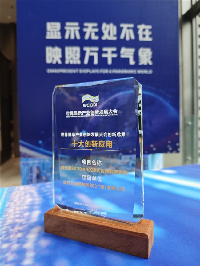 为进一步树立行业标杆、共享创新成果、营造良好产业生态,大会重磅发布“2024世界显示产业创新发展大会创新成果”,由中国电子视像行业协会、中国电子材料行业协会、中国电子专用设备工业协会、中国光学光电子行业协会发光二极管显示应用分会、中国计算机行业协会虚拟现实产业专业委员会、国际信息显示学会中国区、中国OLED产业联盟、世界超高清视频产业联盟、四川省超高清视频产业联盟、成都新型显示行业协会等十余家国内外重点行业机构和单位推荐,大会综合技术领先性、市场竞争性、功能适用性、创新独特性,推选出十大创新技术(产品)、十大创新应用。其中来自广州的超高清视频行业领军企业——4K花园,凭借其自主研发的“满天星8K 3D VR沉浸式视频制作系统”,荣获十大创新应用。
