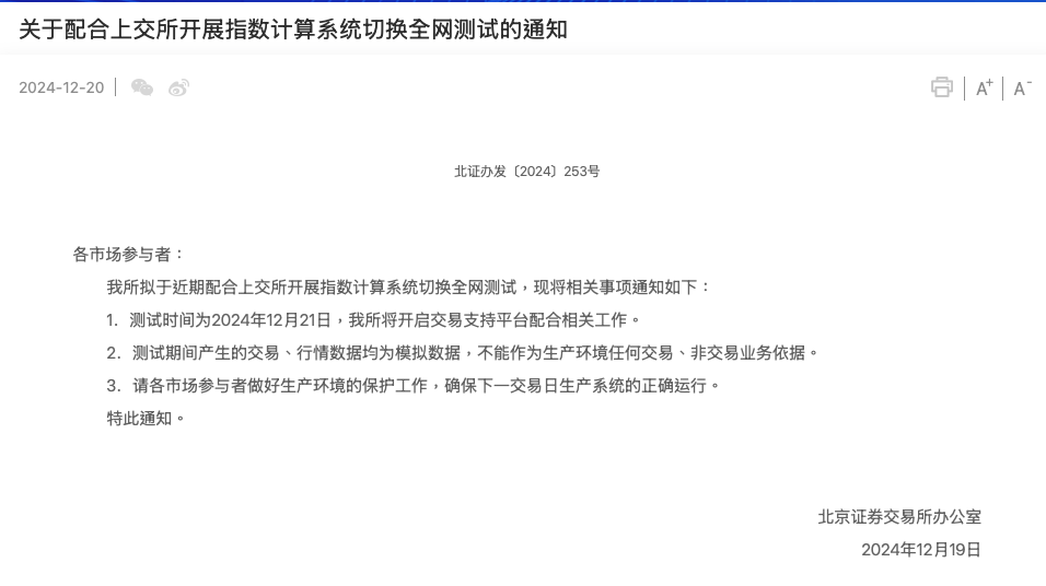 北交所12月20日公告,北交所拟于近期配合上交所开展指数计算系统切换全网测试,测试时间为2024年12月21日,北交所将开启交易支持平台配合相关工作;测试期间产生的交易、行情数据均为模拟数据,不能作为生产环境任何交易、非交易业务依据。