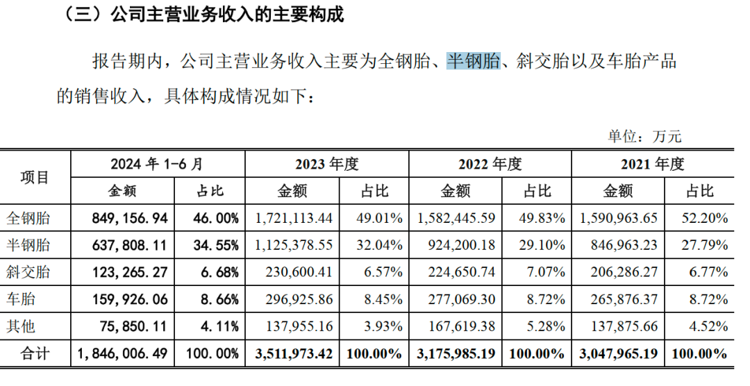 近年来,全钢胎为公司贡献了稳定的收入。2021年至2023年及2024年上半年,全钢胎为公司分别带来159.1亿元、158.24亿元、172.11亿元和84.92亿元,占总营收的比例逐年略降,从52.2%降至46%。