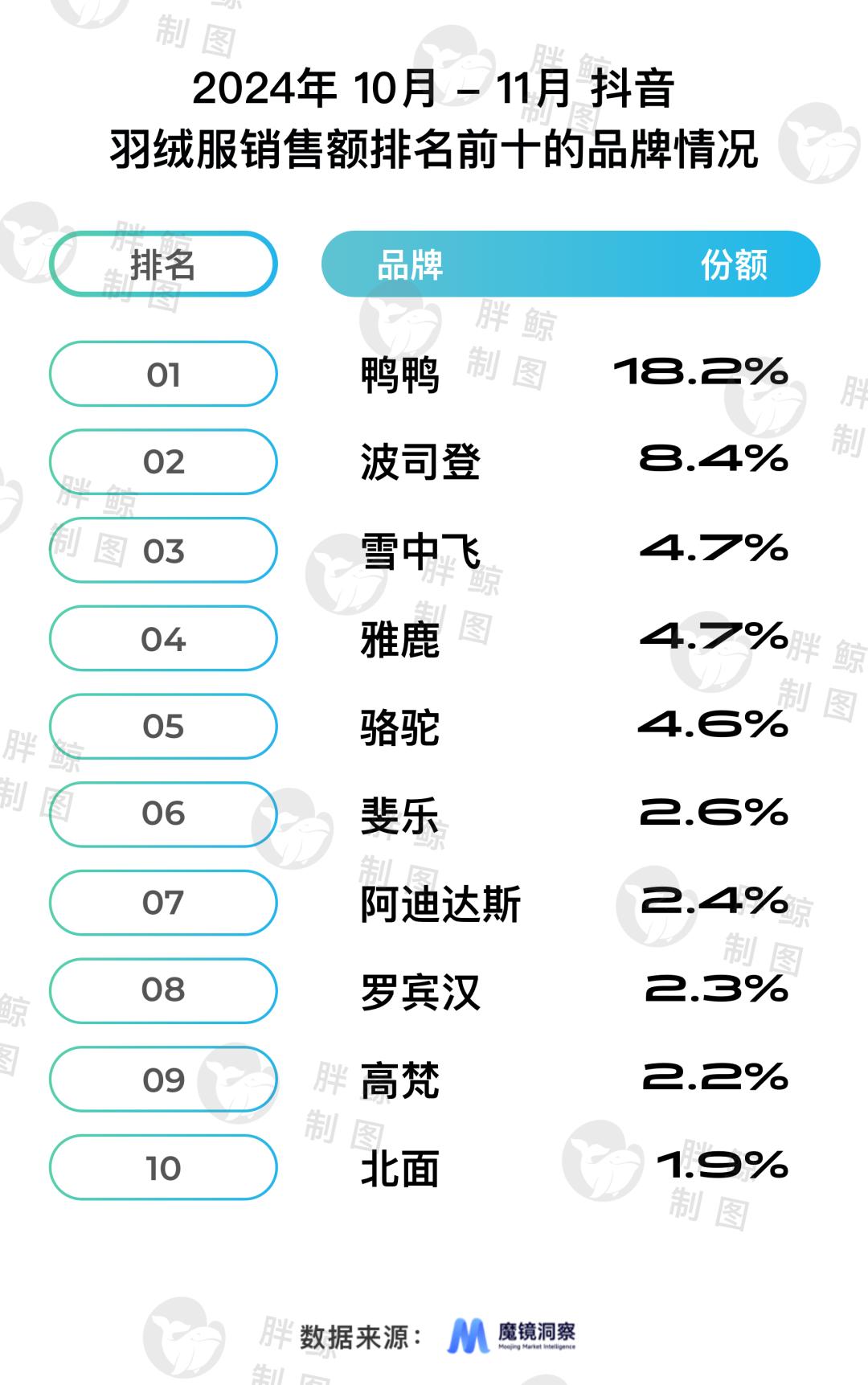 魔镜洞察数据显示,2024年10月-11月,抖音电商羽绒服品类中,鸭鸭凭借着超过32亿元的总销售额,实现了断层领先,占据18.2%的市场份额。