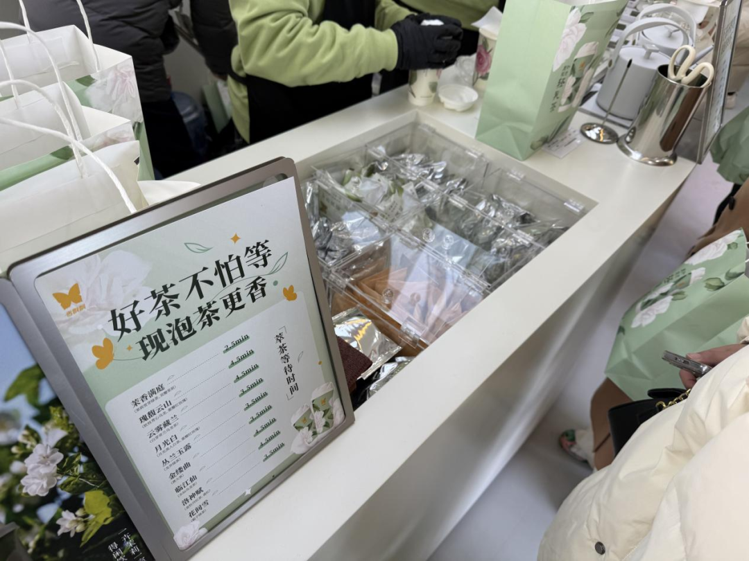 其次,该门店整体布局都在强调“茶”这一元素。例如,正门口的点单处设置了茶包展示区,所有口味的茶包都在此摆放。门店有多处墙面挂着类似“原叶茶包”的宣传标语。