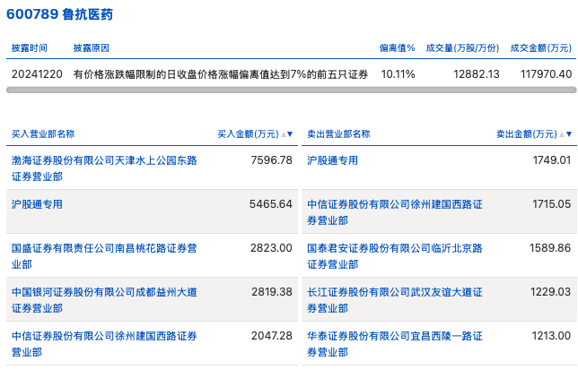 12月20日,鲁抗医药今日涨停,龙虎榜数据显示,上榜营业部席位全天成交2.82亿元,占当日总成交金额比例为23.95%。其中,买入金额为2.08亿元,卖出金额为7495.95万元,合计净买入1.33亿元。