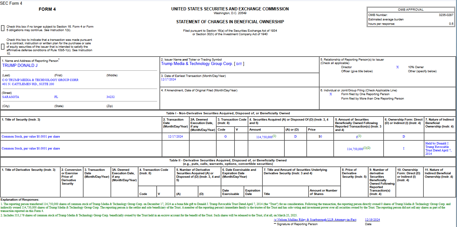 特朗普媒体与科技集团(Trump Media & Technology Group Corp)当地时间12月19日向美国证券交易委员会提交的文件显示,美国当选总统特朗普于2024年12月17日将114,750,000股公司普通股无偿转让给特朗普可撤销信托(Trump Revocable Trust),交易完成后,特朗普直接持有0股公司股份。文件显示,特朗普是该信托的委托人和唯一受益人。这些股份价值约40亿美元,特朗普可撤销信托是一个由其长子小唐纳德·特朗普控制的信托基金。