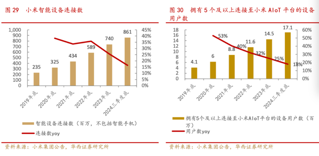 而米粉文化转为对智能生态的粘性,并进一步提高品牌复购率的影响也不容忽视。根据小米2024年10月发布会,小米最新的软件系统在设备互联方面持续提升用户体验。根据小米公告,截止2024年三季度底,小米智能设备连接数超过8亿个,其中拥有5个以上连接设备的用户数约1700万。