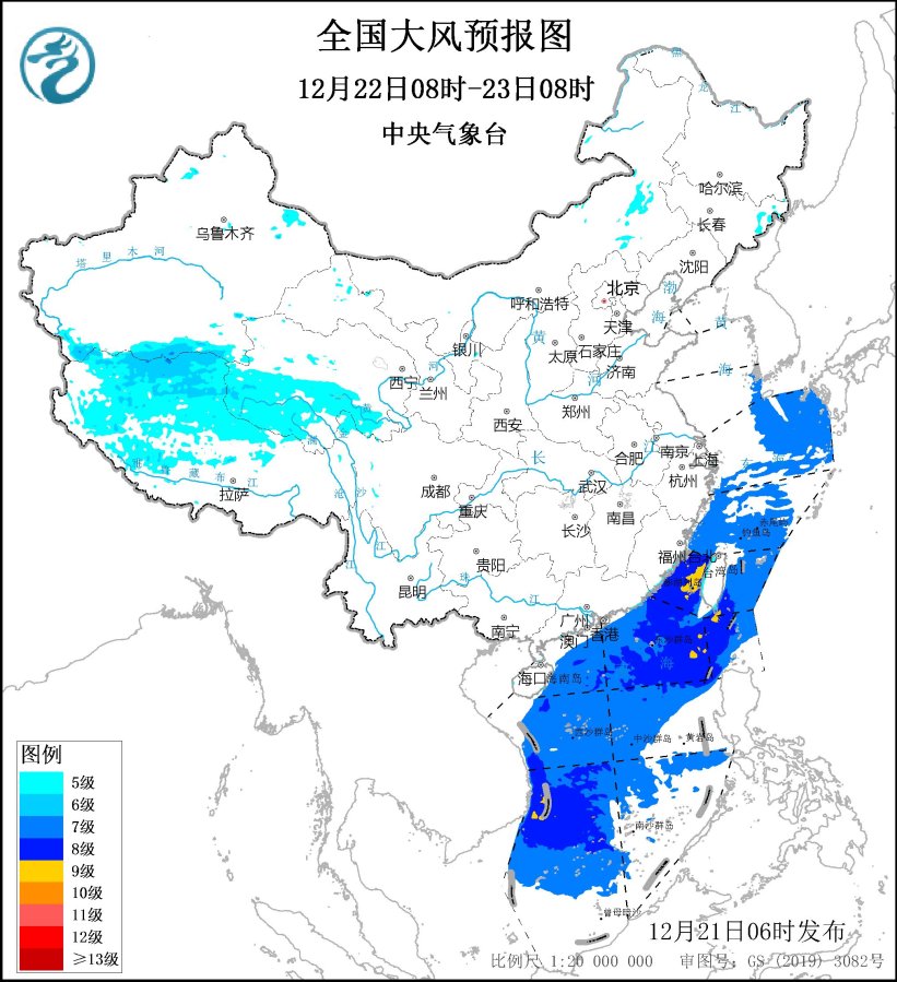 12月22日08时至23日08时,西藏北部、青海南部、甘肃西部、内蒙古东部等地部分地区将有5~6级、阵风7~8级的大风;东海大部海域、台湾海峡、台湾以东洋面、巴士海峡、南海大部海域将有7~8级、阵风9~10级的大风,其中台湾海峡、台湾以东洋面、巴士海峡、南海东北部和西南部的部分海域风力可达9级、阵风10~11级。
