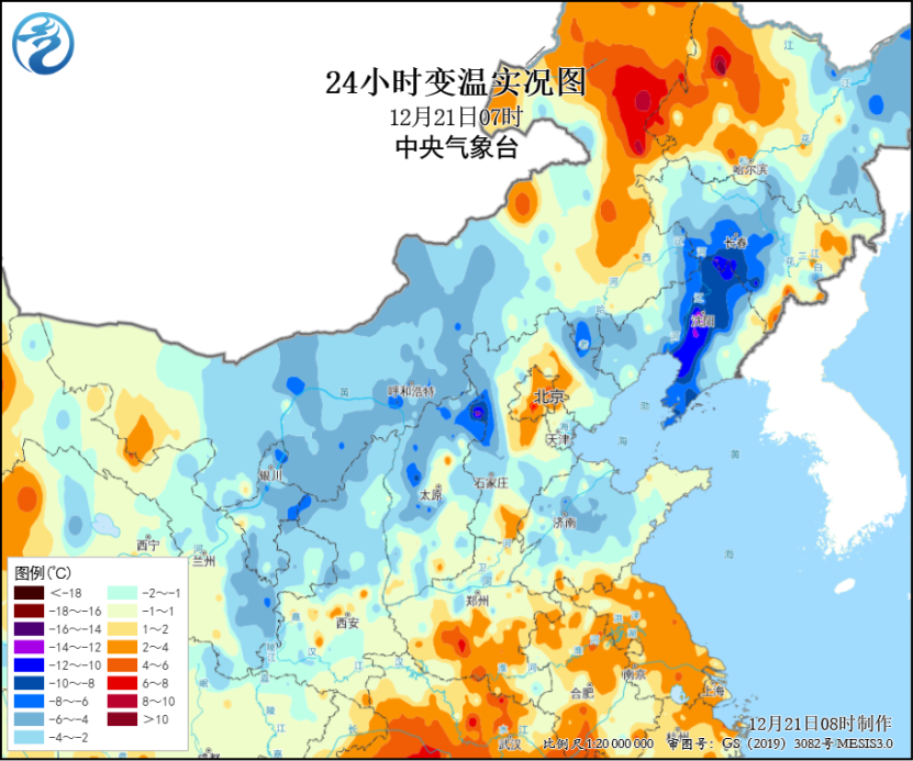 中央气象台12月21日消息,昨日,冷空气继续东移南下影响我国,内蒙古中东部、华北北部和西部及新疆北部和南疆西部、甘肃西部等地部分地区出现6~8级阵风,局地9~11级;今早,吉林中部、辽宁中东部及山西北部等地降温6~10℃,局地降幅超过12℃。今晨,我国东部多地如内蒙古二连浩特(-21.6℃)、黑龙江佳木斯(-27.1℃)、吉林长春(-19.7℃)、辽宁沈阳(-17.6℃)及河北崇礼(-20.2℃)等,气温均创下了入冬以来的新低。