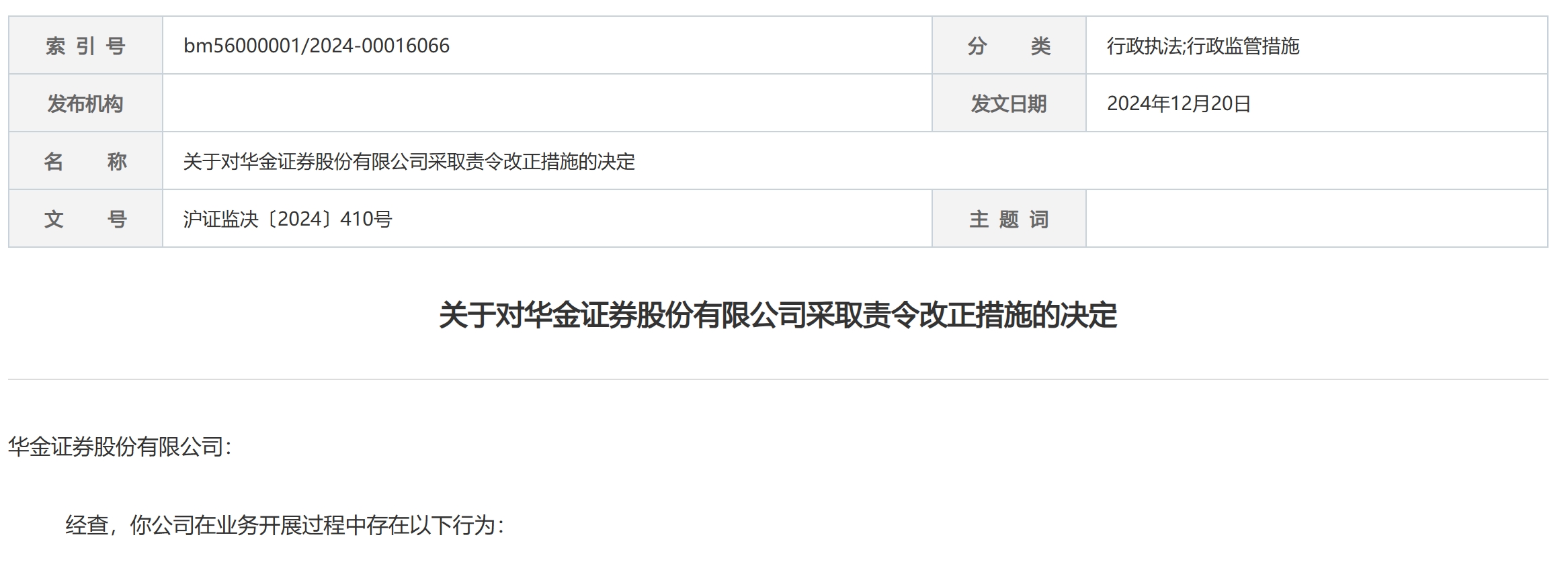 12月20日,证监会上海监管局发布对华金证券采取责令改正措施的决定。